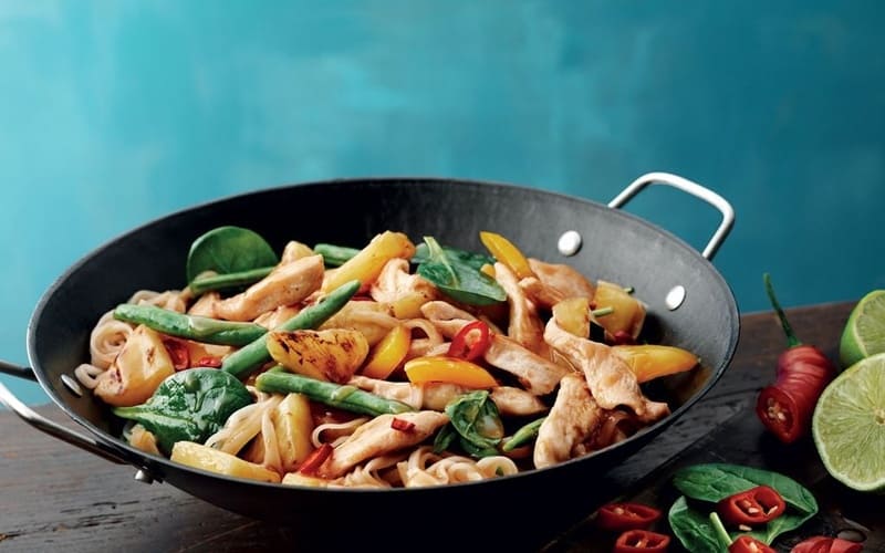 ووك دجاج عطري مع فيليه دجاج عصاري، خضروات طازجة (بروكلي، جزر، فلفل، بصل) وصلصة الصويا التقليدية. طبق سريع وصحي يمنح